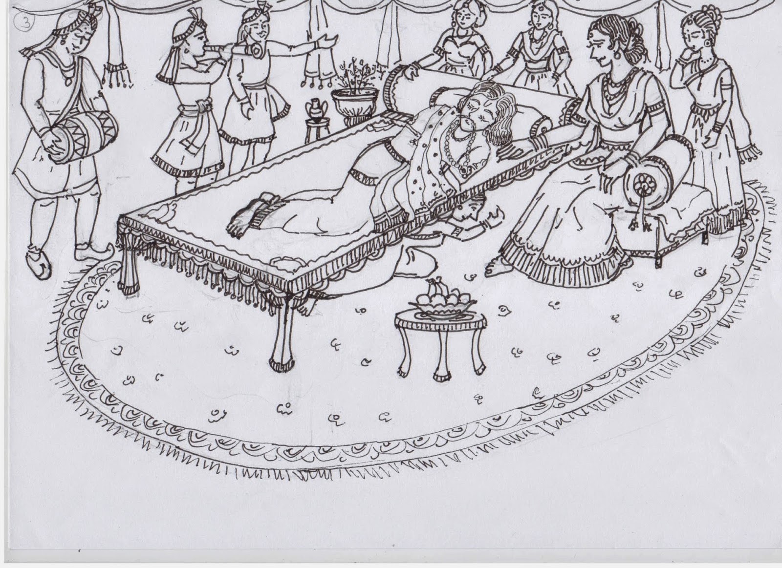 servants were walking everywhere in the palace. So he hid under the king’s bed. From there, he saw royal arrangements being made to wake up the king. Elephants and horses were neighing, the scholars were reciting Vedic hymns, the