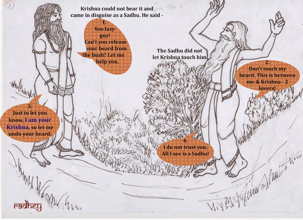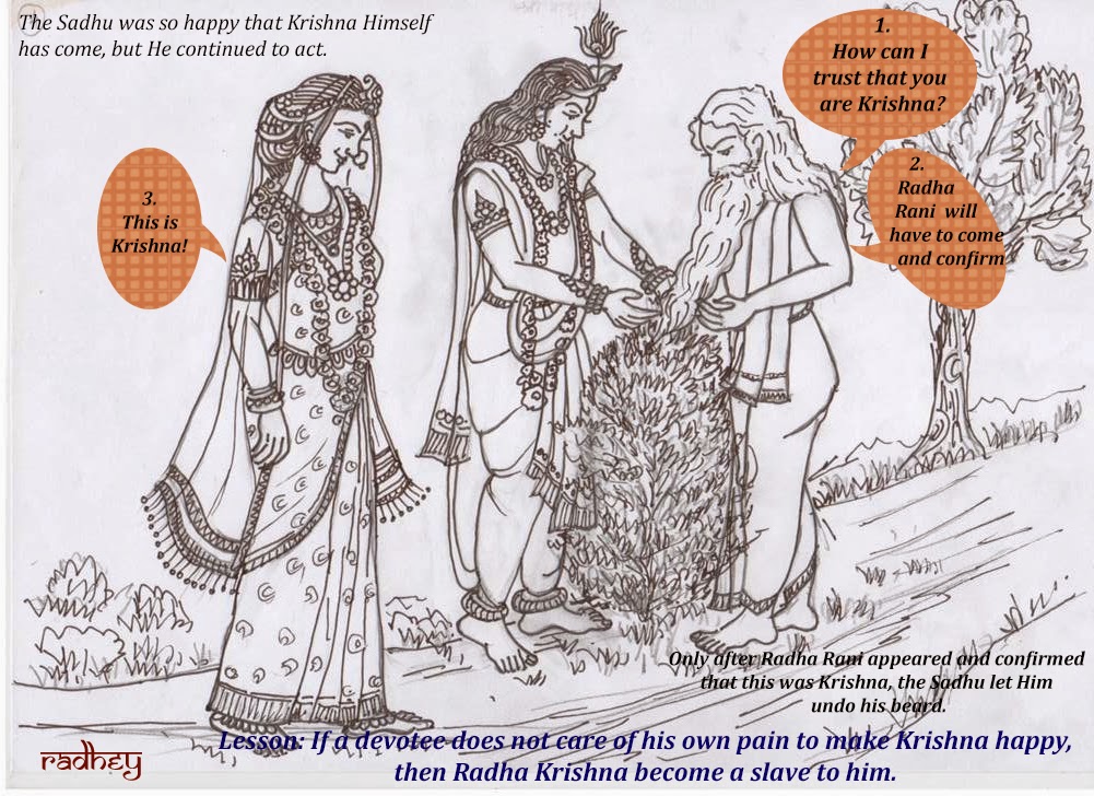 This story was referred to by Jagadguru Shri Kripalu Ji Maharaj to explain how a devotee can get everything without asking for anything.If a devotee does not care of his own pain to make Krishna happy, then Radha Krishna, the Yugal Sarkar become a slave to him.